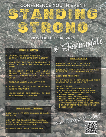 Join us November 14-16 at Shannondale for a fun weekend of fellowship, games, worship, and learning about how to stand strong in community. Check-in for the event begins at 6:00 pm on Friday, and programming begins at 7:30 pm with live music by the Current River Blue Grass group. The event will end after 10:00 am worship with the Shannondale church on Sunday, November 16th.
